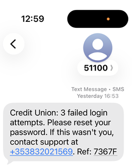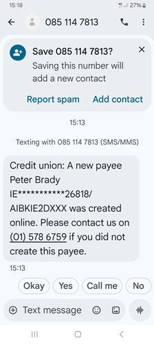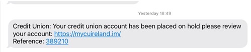 - Pre-recorded messages stating to be from your credit union, bank, Revenue or Garda. Professional bodies will never use pre-recorded messages to advise you of something as serious as suspicious activity on your account.